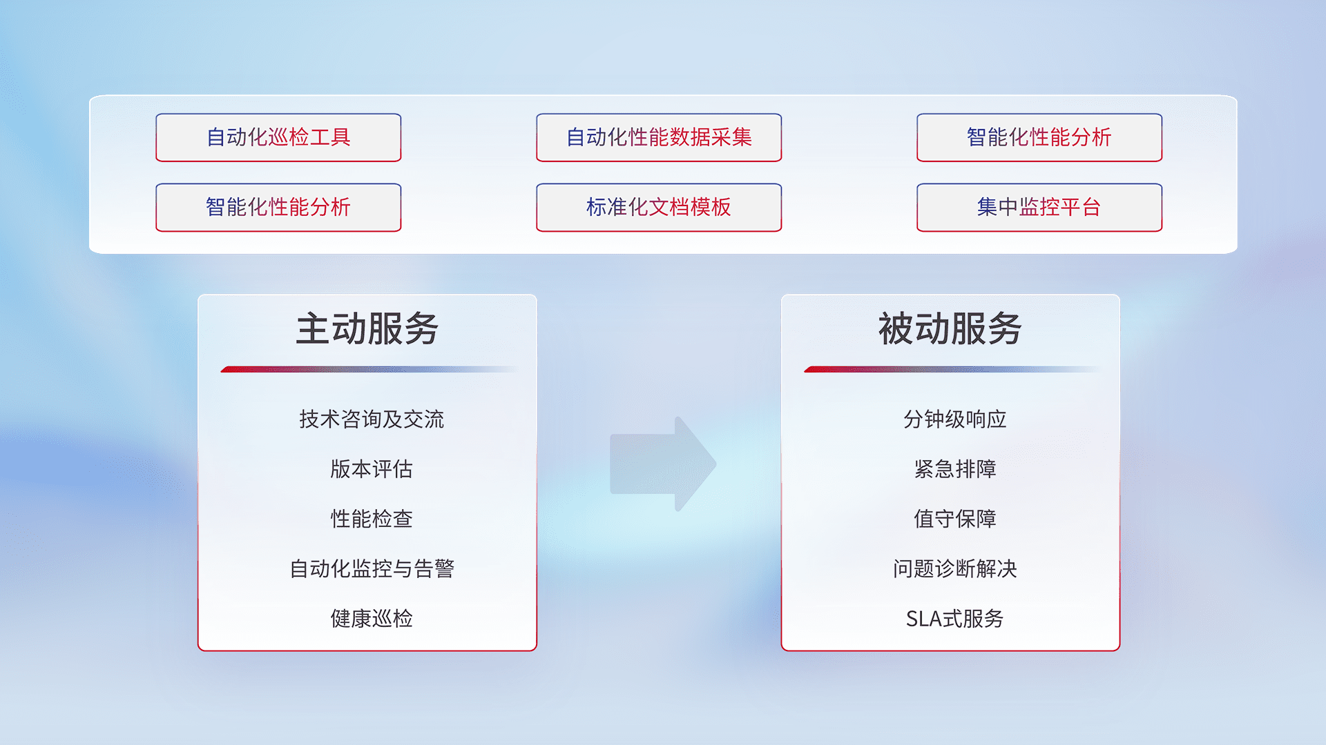 智能化工具和标准化文档,,保障服务质量,,,提供主动服务(包含技术咨询、、、版本评估、、、、性能检查、、、、自动化监控与告警、、健康巡检)和被动服务包含(分钟级响应、、紧急排障、、值守保障、、问题诊断解决、、、、SLA服务)。。